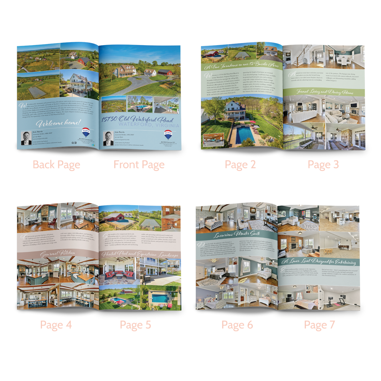 Brochure featuring a waterfront home for sale in Waterford, Virginia, with pages showing exterior shots, interior rooms, kitchen, pool, and landscape.