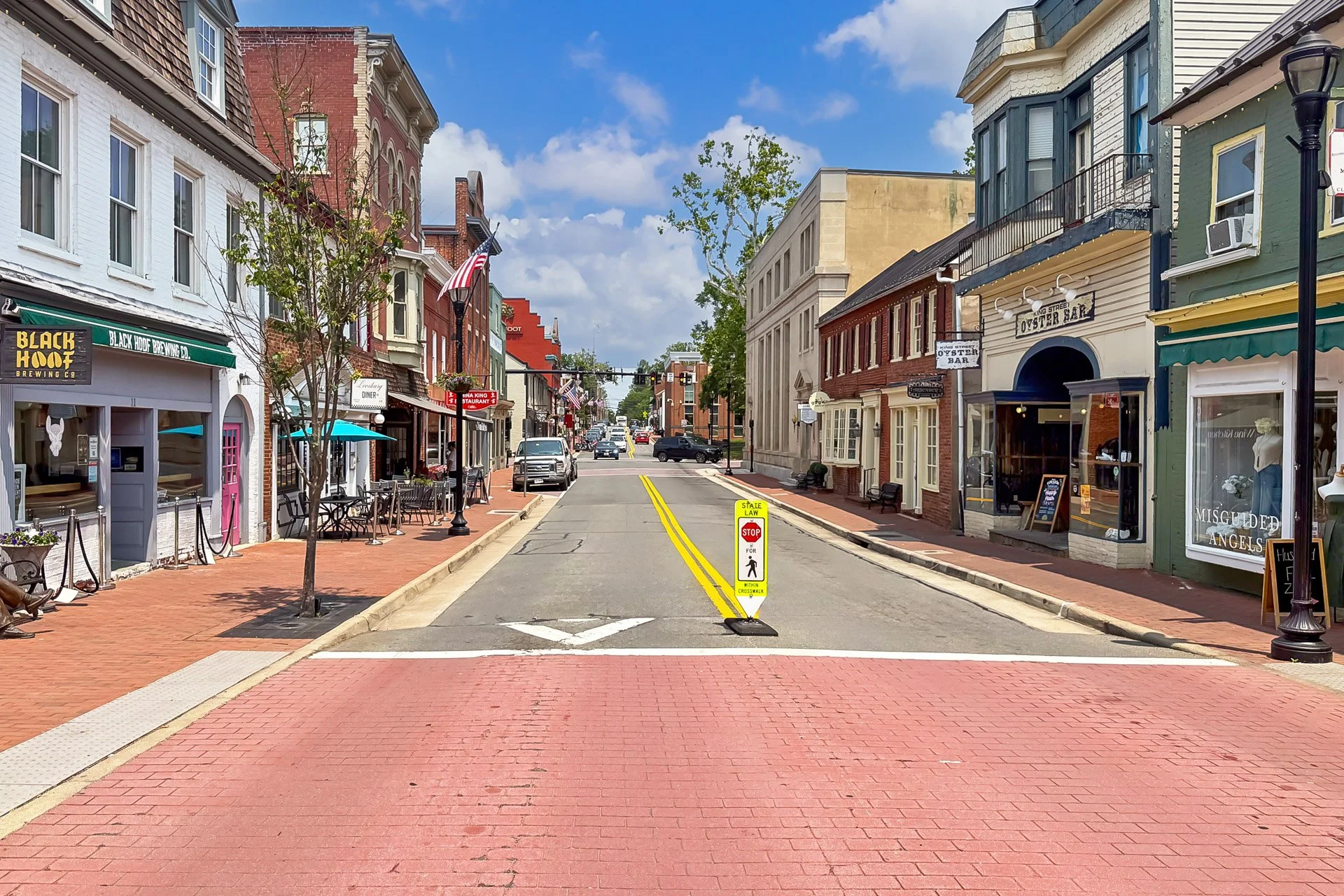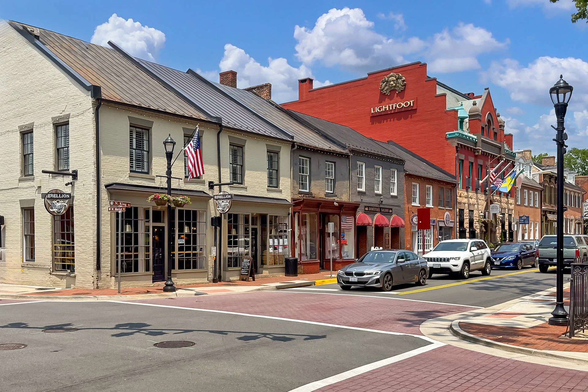 Street view of historic buildings with shops and parked cars under a partly cloudy sky. A white brick building with a black sign that says 'Rebellion,' American flags, and hanging flower baskets is in the foreground. Behind it, there's a red brick bu