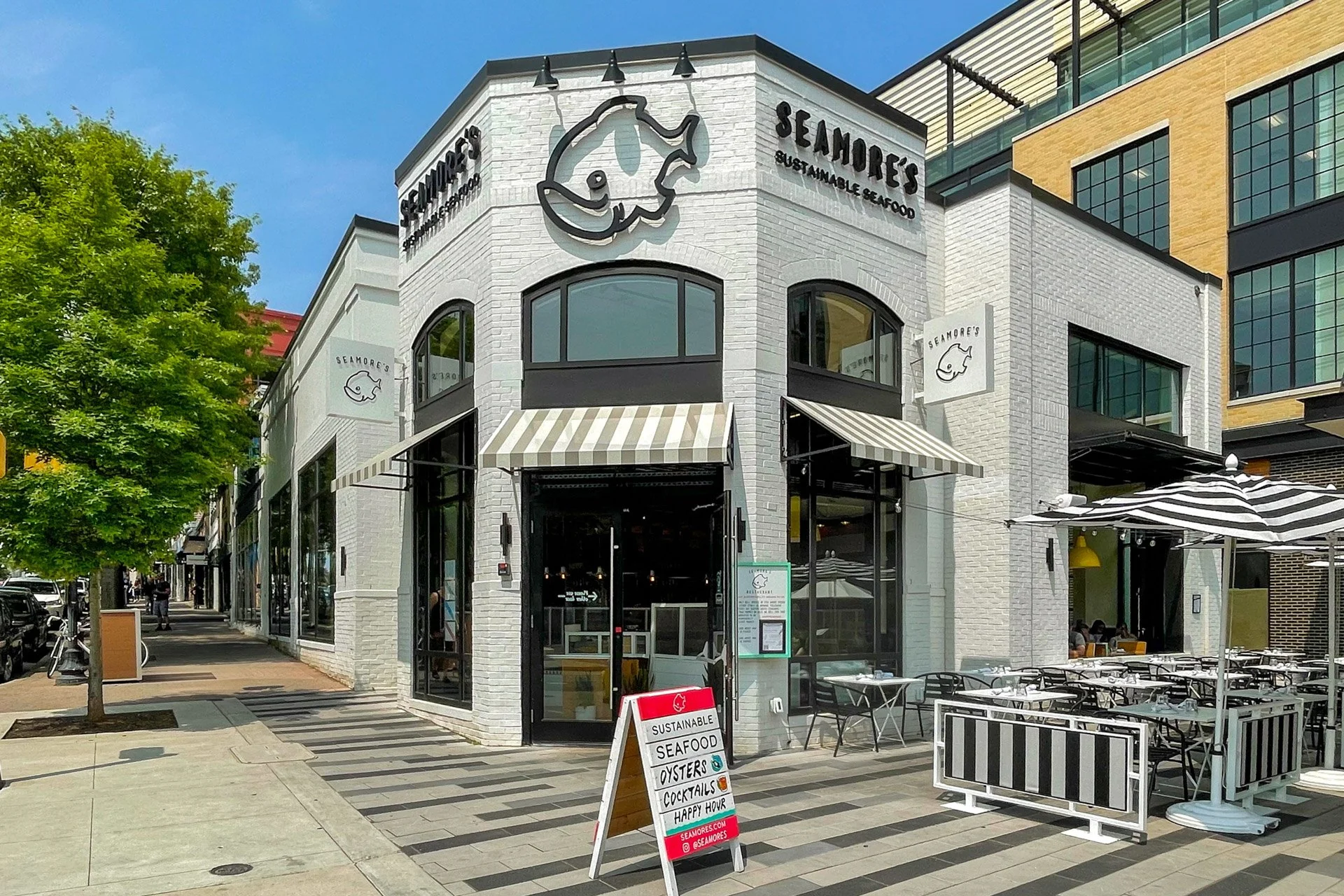 Exterior view of a seafood restaurant named Seamoré's with white brick and large glass windows, outdoor dining area with black and white striped umbrellas, and a sidewalk sign advertising sustainable seafood, oysters, cocktails, and happy hour, with