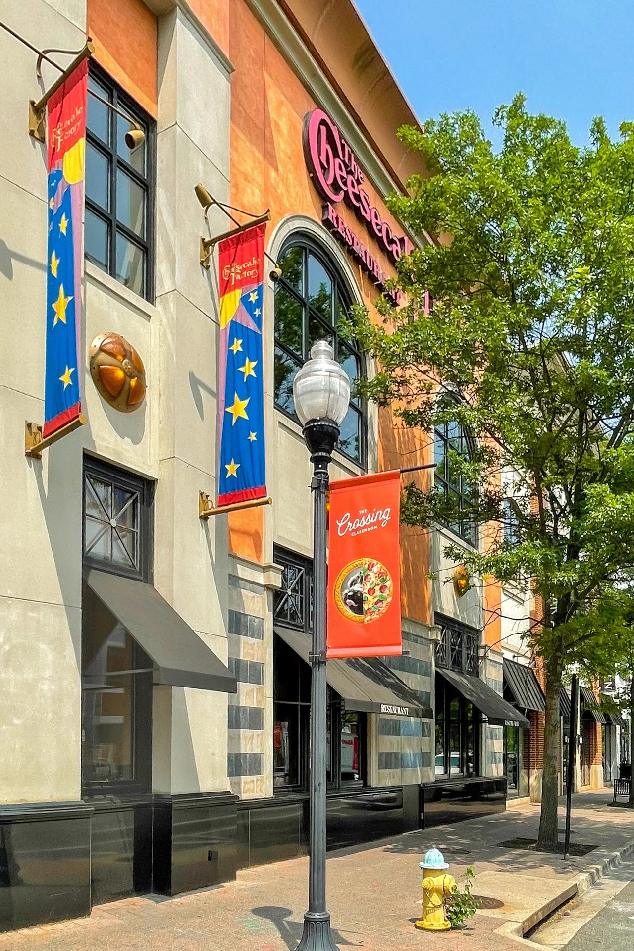 Street view of a restaurant called The Crossing with colorful flags and banners, trees lining the sidewalk, and a bright blue sky.