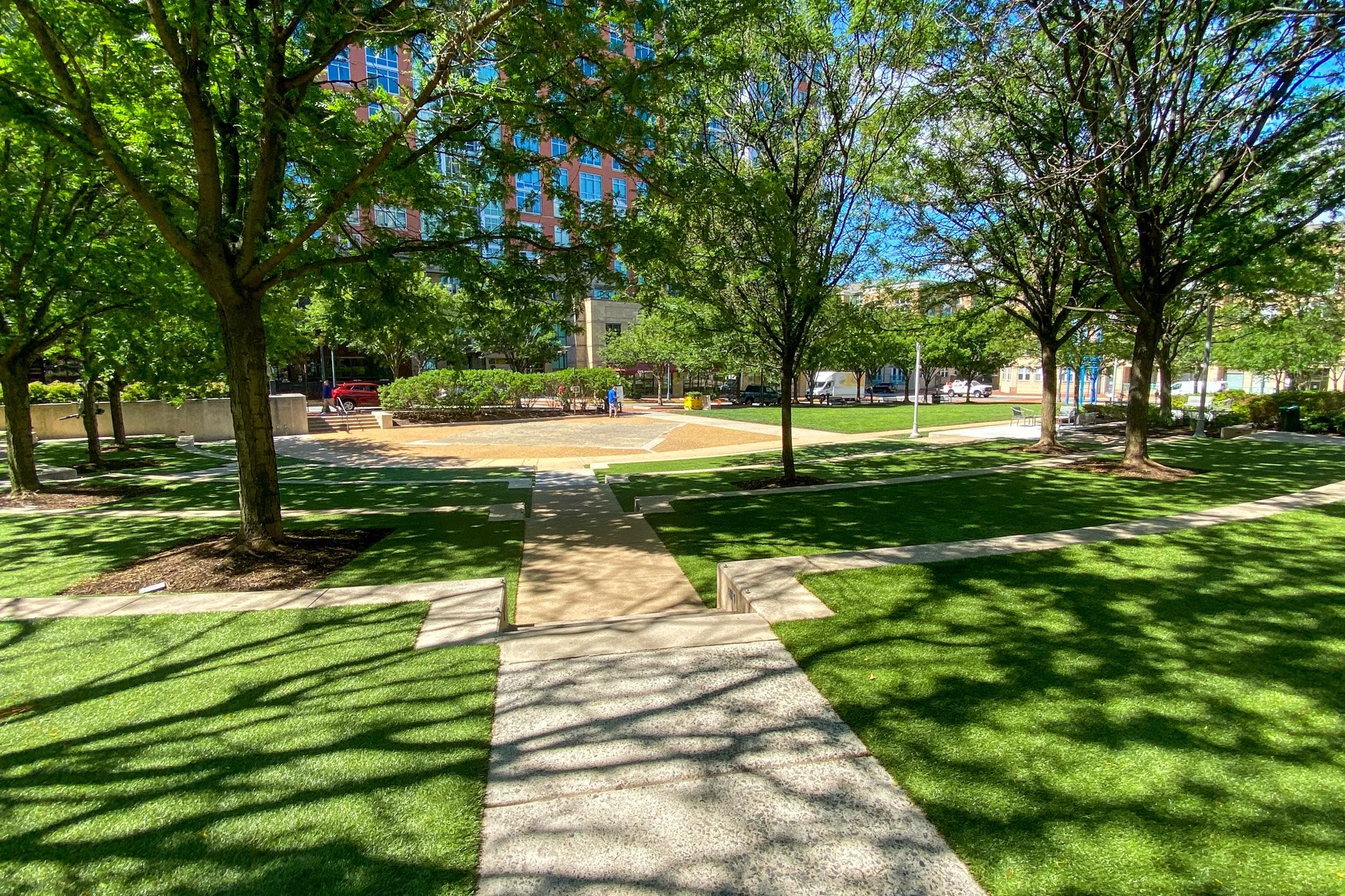 A park with green grass, paved walkways, and trees casting shadows. In the background, there are buildings and a few people walking.