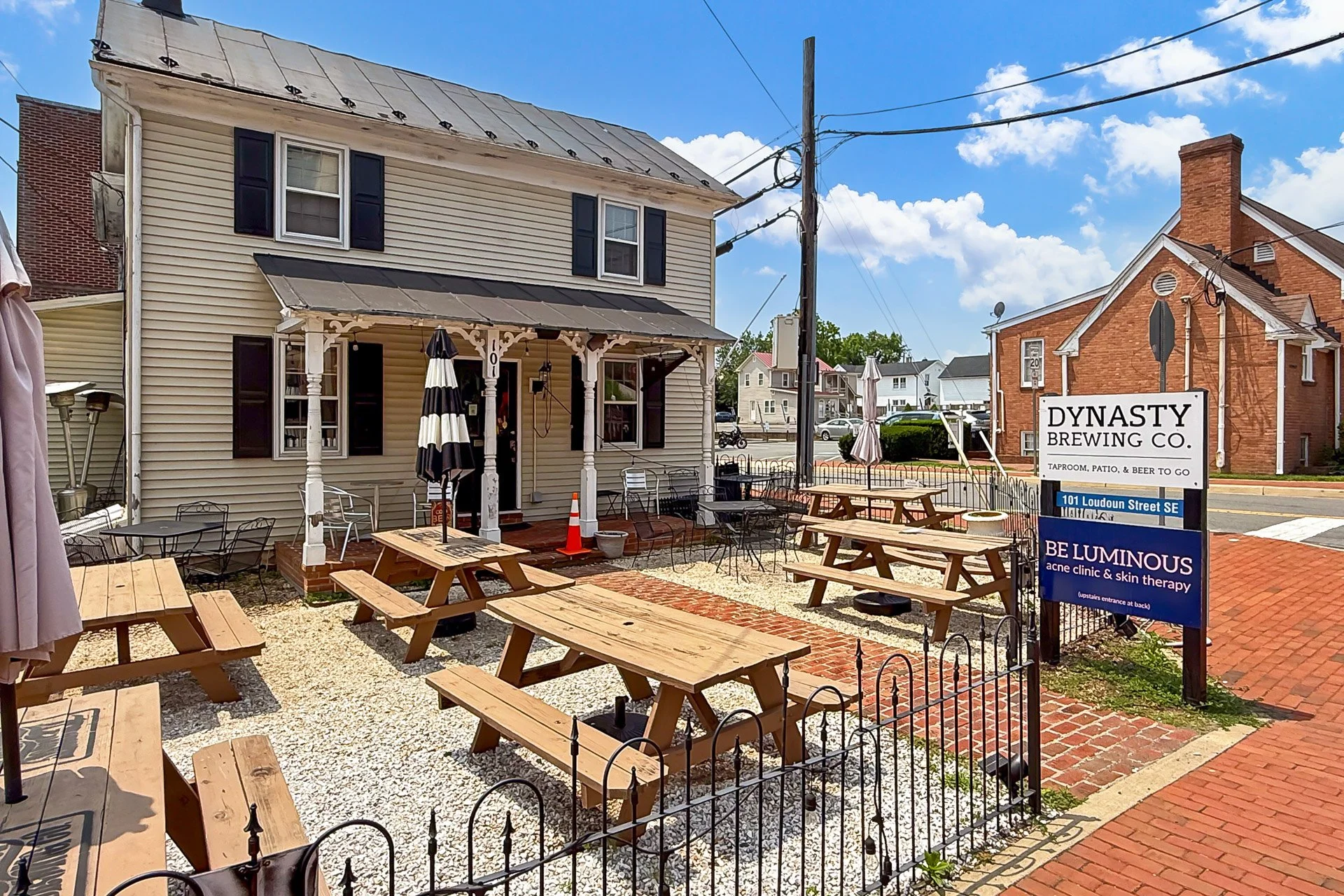 Outdoor seating area with wooden picnic tables, umbrellas, and chairs in front of a yellow building with black shutters, under a partly cloudy sky. There are signs for Dynasty Brewing Co. and Be Luminous.