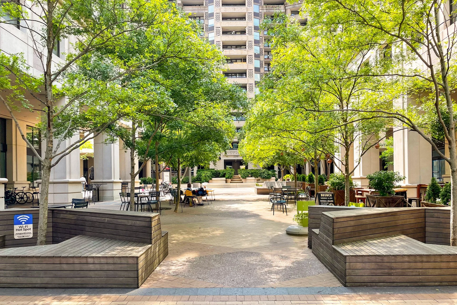Outdoor view of Ballston Quarter shopping mall with a central garden area filled with green plants and flowers, flanked by modern brick and glass buildings.