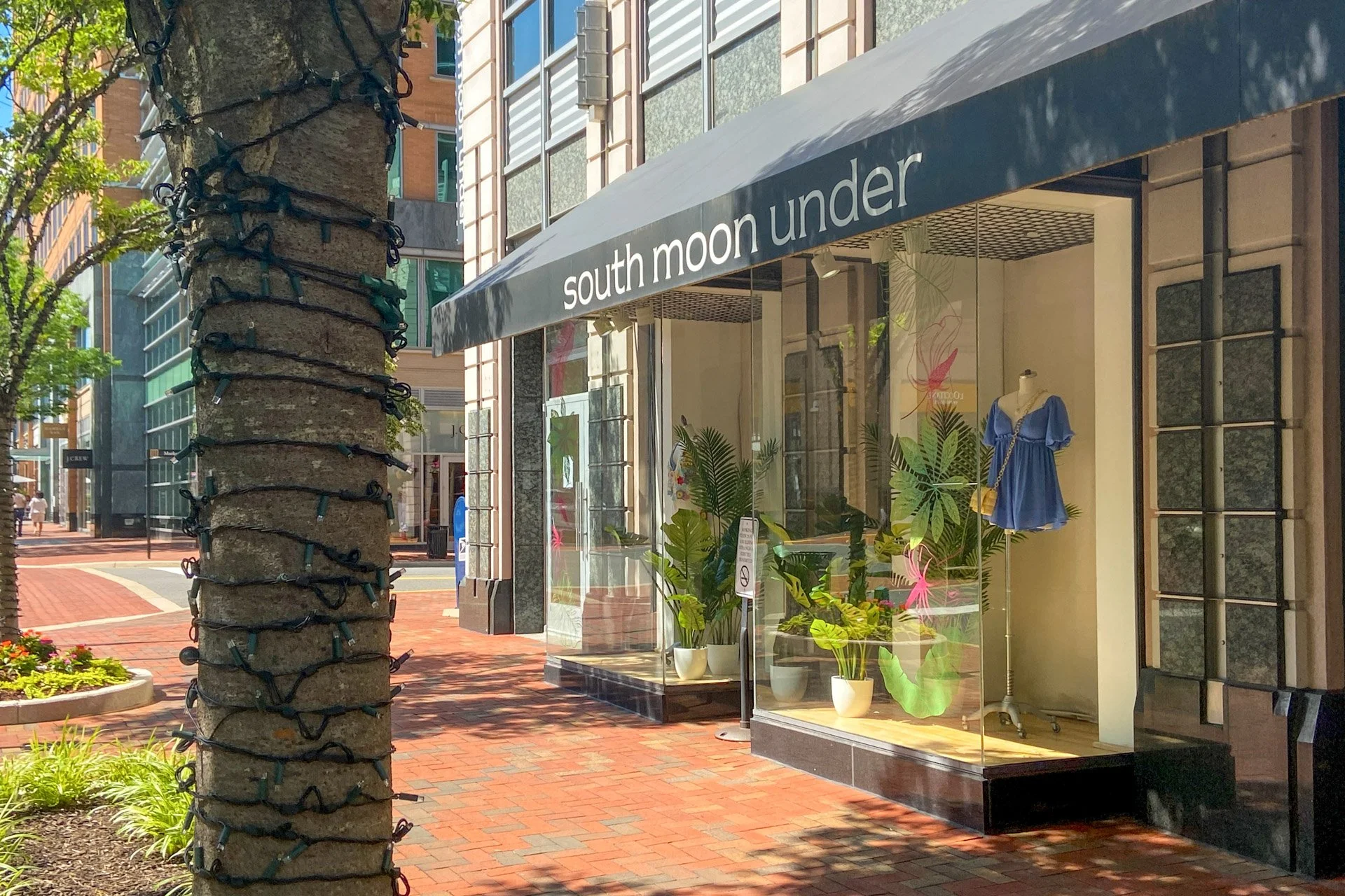 Storefront with a black awning that reads 'south moon under' and display window with plants and a blue dress.
