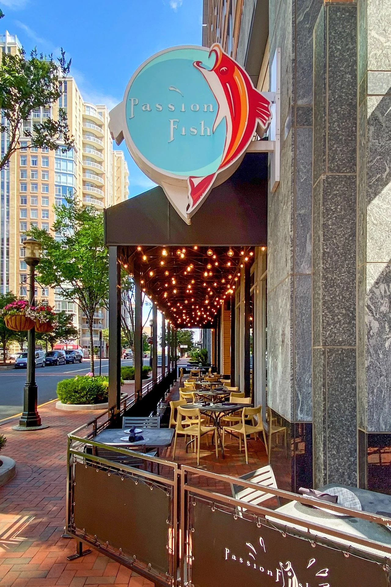 Outdoor restaurant named Passion Fish with string lights, tables and chairs, on a city street with tall buildings and trees.