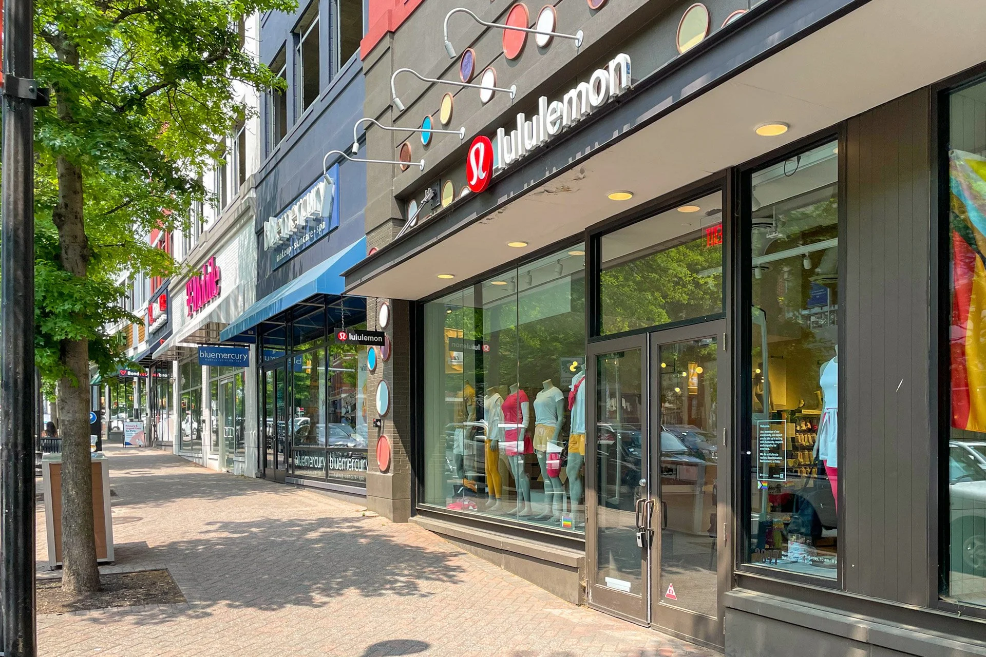 Street view of retail stores, including Lululemon and Bluemercury, with mannequins dressed in athletic clothing visible through the glass storefronts on a sunny day.